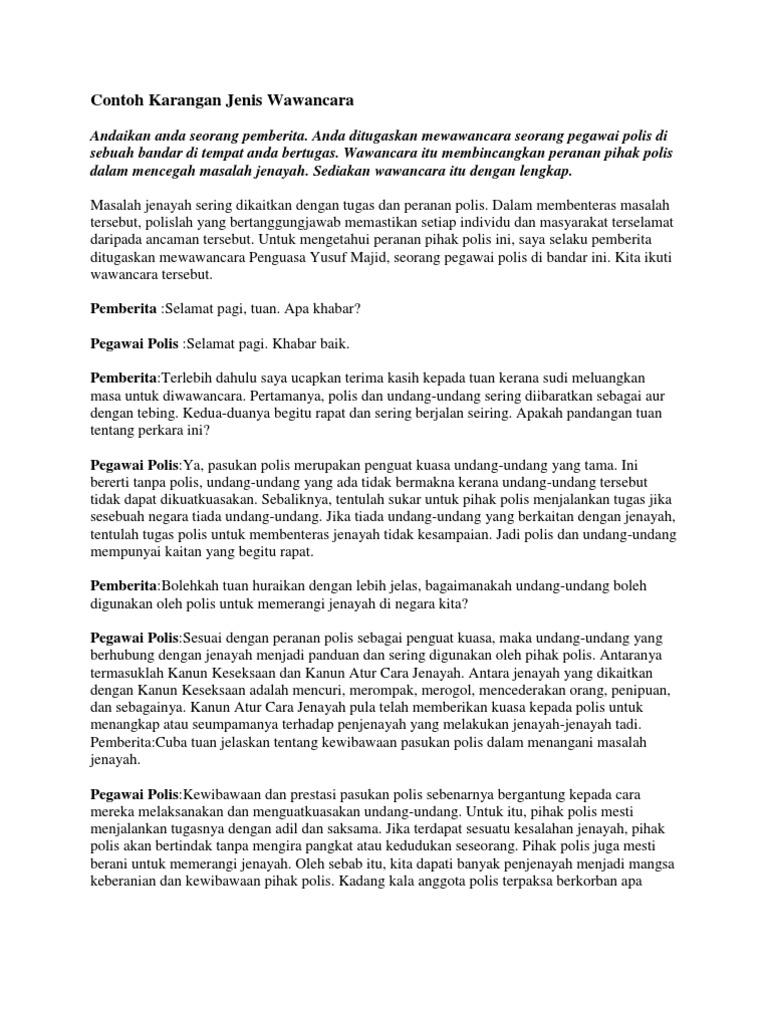 I Contoh karangan 1. Hasil temu ramah itu akan dimuatkan. Anda ditugaskan mewawancara seorang pegawai polis di sebuah bandar di tempat anda bertugas.